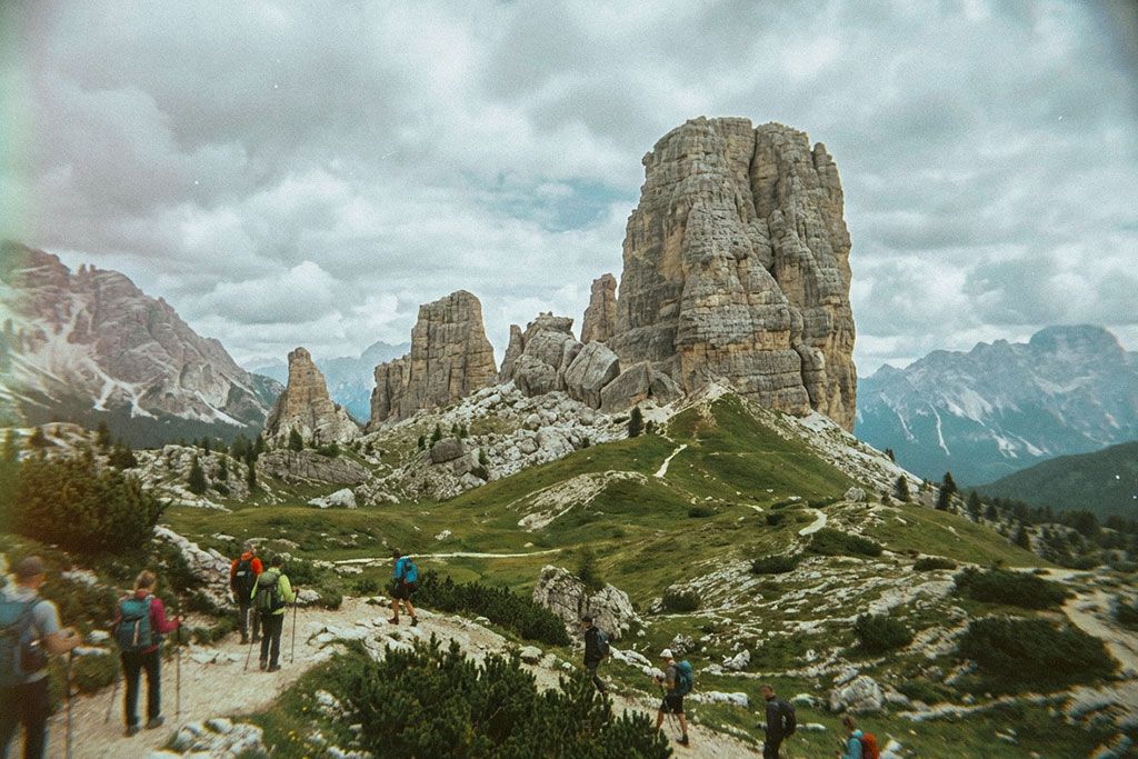 Da Ancora Cortina si raggiunge Bai de Dones, punto di partenza per la seggiovia o per un sentiero che sale al Rifugio Scoiattoli. Da lì, si cammina tra trincee e postazioni restaurate, oggi museo a cielo aperto. Le Cinque Torri raccontano il fronte dolomitico della Grande Guerra, ma anche la quiete dei prati e delle vette circostanti. Oggi sono anche una delle falesie più iconiche di Cortina. Il cammino si conclude con un pranzo in rifugio.